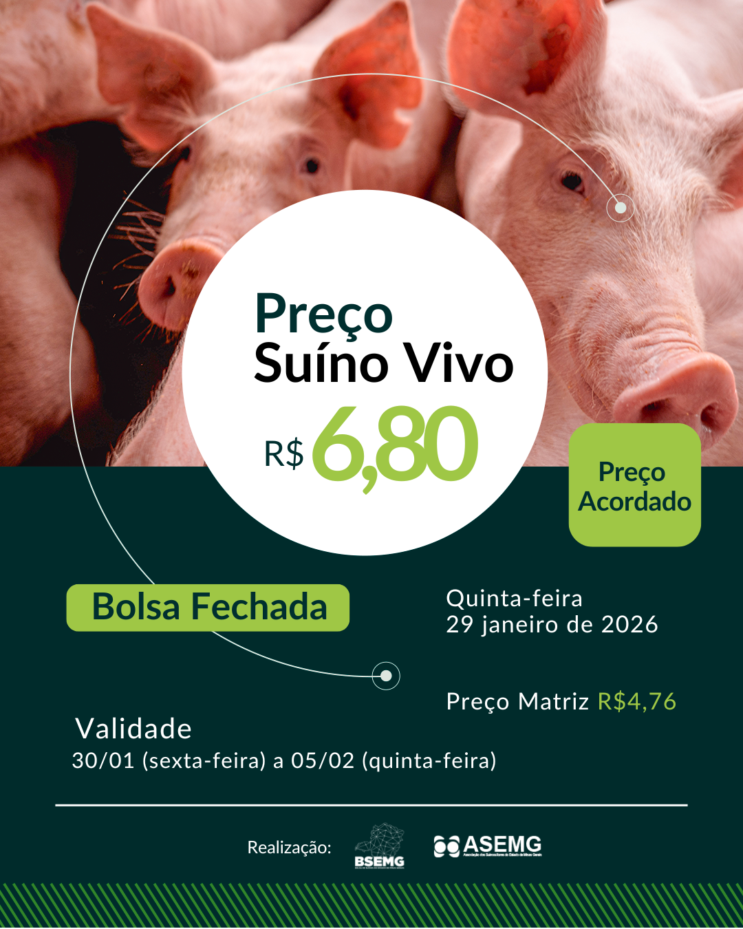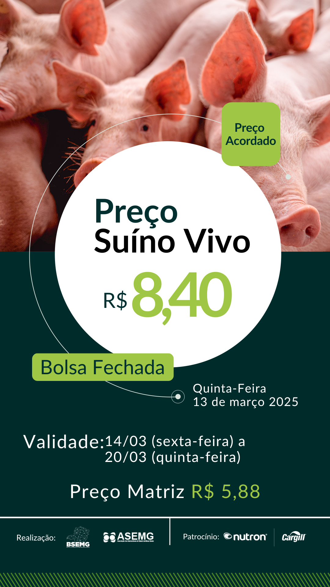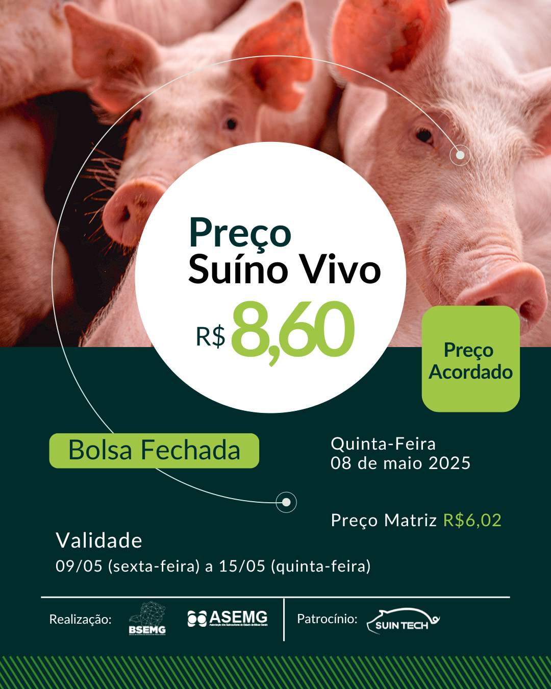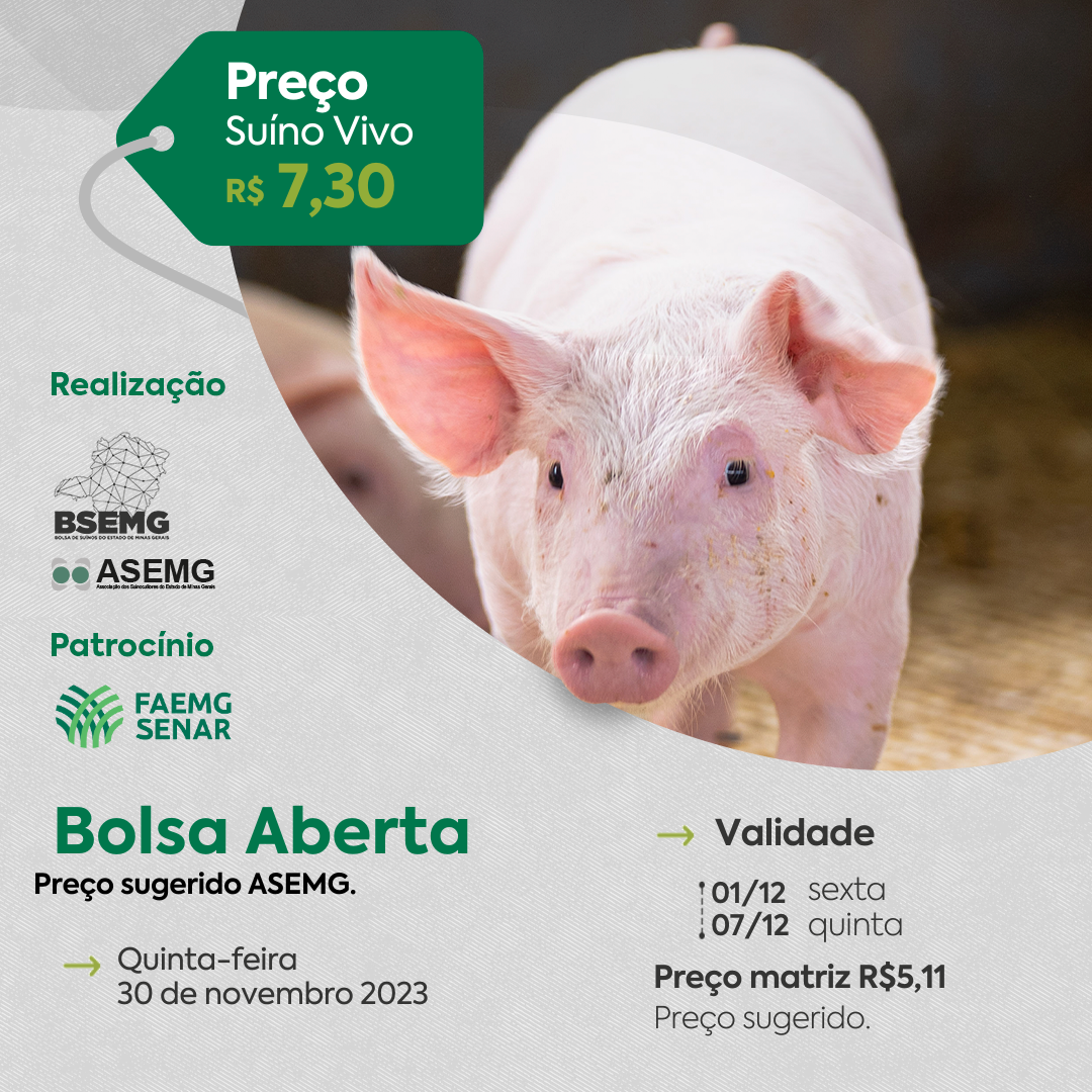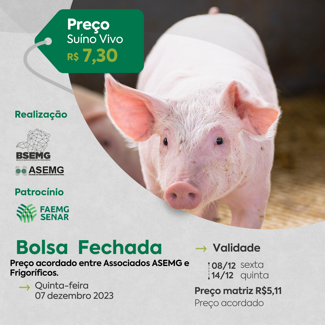 BSEMG é a Bolsa de Suínos do Estado de Minas Gerais. Somos responsáveis por levantar os dados relativos à comercialização de suínos, analisar e precificar o quilo do suíno vivo no estado de Minas Gerais.