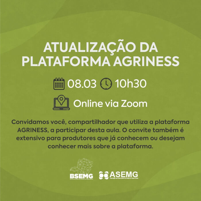 A Associação dos Suinocultores do Estado de Minas Gerais (ASEMG), promoverá no dia 08 de março, às 10h30, de forma remota, um aulão para ensinar aos compartilhadores de dados da plataforma AGRINESS como fazer a mais nova atualização.