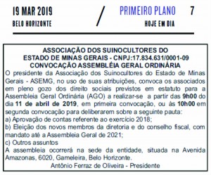 Belo Horizonte, 11 de Março de 2019 – Em 2019 se encerra mais um ciclo na direção da ASEMG. No dia 11/04 (quinta-feira) os associados da entidade devem comparecer a sede da mesma para juntos definirem os suinocultores que serão os responsáveis por administrarem a Associação dos Suinocultores do Estado de Minas Gerais no decorrer […]