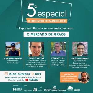 A edição do mês outubro, teve como tema o debate sobre gestão de custos com foco na suinocultura. Na quinta-feira (14) , com transmissão pelo Youtube, a Associação do Suinocultores do Estado de Minas Gerais (ASEMG), realizou mais uma edição do Projeto 5ª especial: “O encontro da Suinocultura Mineira”, com o tema: Gestão de custos […]
