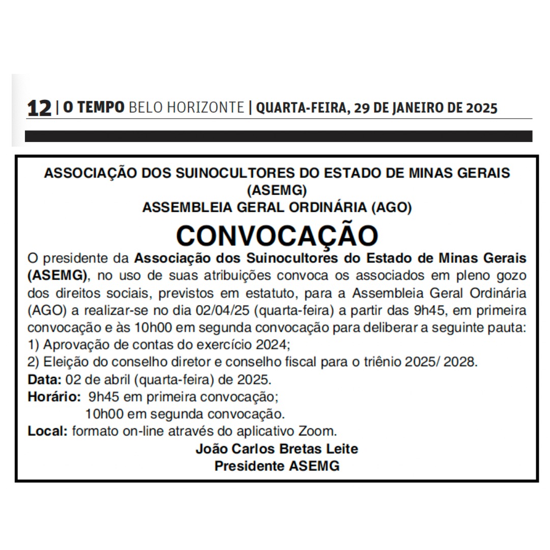 O presidente da Associação dos Suinocultores do Estado de Minas Gerais  (ASEMG) , no uso de suas atribuições convoca os associados em pleno gozo dos direitos sociais, previstos em estatuto, para a Assembleia Geral Ordinária (AGO) a realizar-se no dia 02/04/25 (quarta-feira) a partir das 9h45, em primeira convocação e às 10h00 em segunda convocação para deliberar a seguinte pauta: