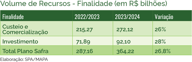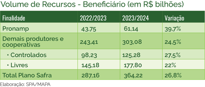 De acordo com o Ministério da Agricultura e Pecuária, os recursos vão apoiar a produção agropecuária nacional de médios e grandes produtores rurais até junho de 2024. O valor é destinado para o crédito rural para produtores enquadrados no Programa Nacional de Apoio ao Médio Produtor Rural (Pronamp) e demais.